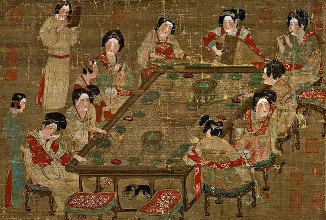 ▲《唐人宫乐图》。该图为唐代佚名者创作的绢本墨笔画,现藏于台北故宫博物院。画面描绘了一群宫中女眷围着桌案宴饮行乐的场面,妇人吹奏畅饮,欢畅热闹。(图片来源于网络)
