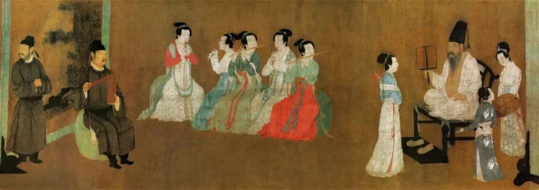 ▲《韩熙载夜宴图》局部。《韩熙载夜宴图》为南唐顾闳中所绘,现存宋摹本,绢本设色,现藏于北京故宫博物院。上图为管乐合奏部分,画面中五个奏乐人横坐一排,各有动态,虽同列一排,却无板滞之感。(图片来源于网络)