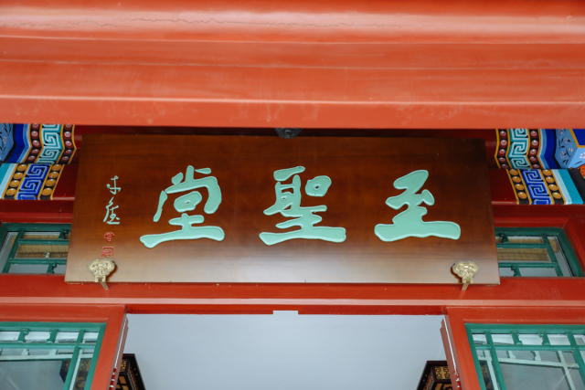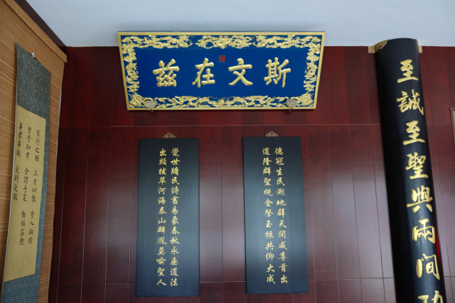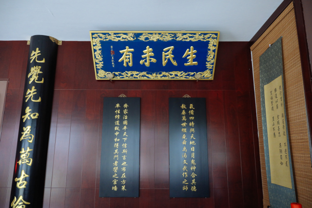 堂前楹柱上镌有书院荣誉院长楼宇烈先生题写的楹联:“集天地正气砥砺涵养尊德性,读古今文章琢磨切磋道问学”,启发学问根源;堂内正中为先师孔子行教像,四周配以颜渊、曾子、孟子、子思四圣。举目“万世师表”“斯文在兹”“生民未有”赫然在上,乃清帝康熙、雍正、光绪御赐之文。